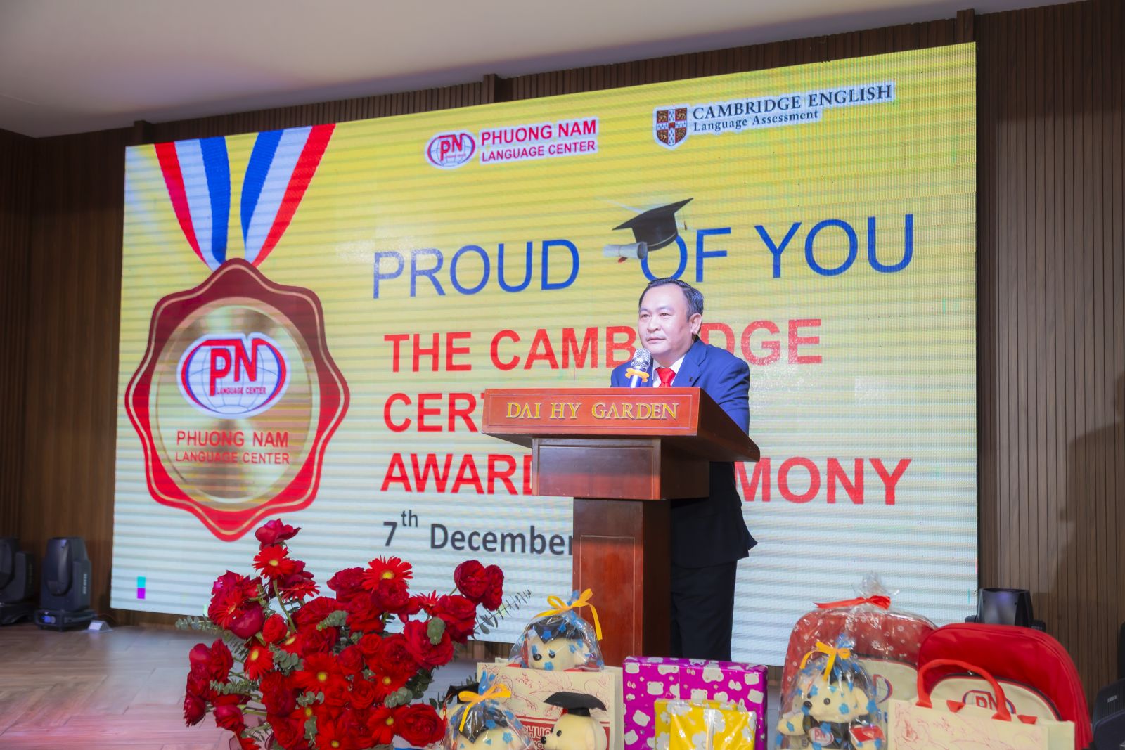 Mở đầu chương trình, Ông Nguyễn Phương Lâm – Tổng Giám đốc Hệ thống Trung Tâm Ngoại Ngữ Phương Nam đã có bài phát biểu chúc mừng và ghi nhận những nỗ lực bền bỉ của các em học viên trong suốt quá trình học tập. Ông đồng thời nhấn mạnh vai trò của chương trình đào tạo chuẩn CAMBRIDGE trong việc xây dựng nền tảng tiếng Anh vững chắc, giúp học viên tự tin hội nhập và phát triển trong tương lai.